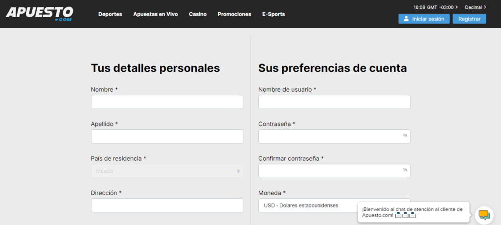 Accediendo dentro del sitio oficial de Apuesto, en donde tendrás que completar el formulario de registro.